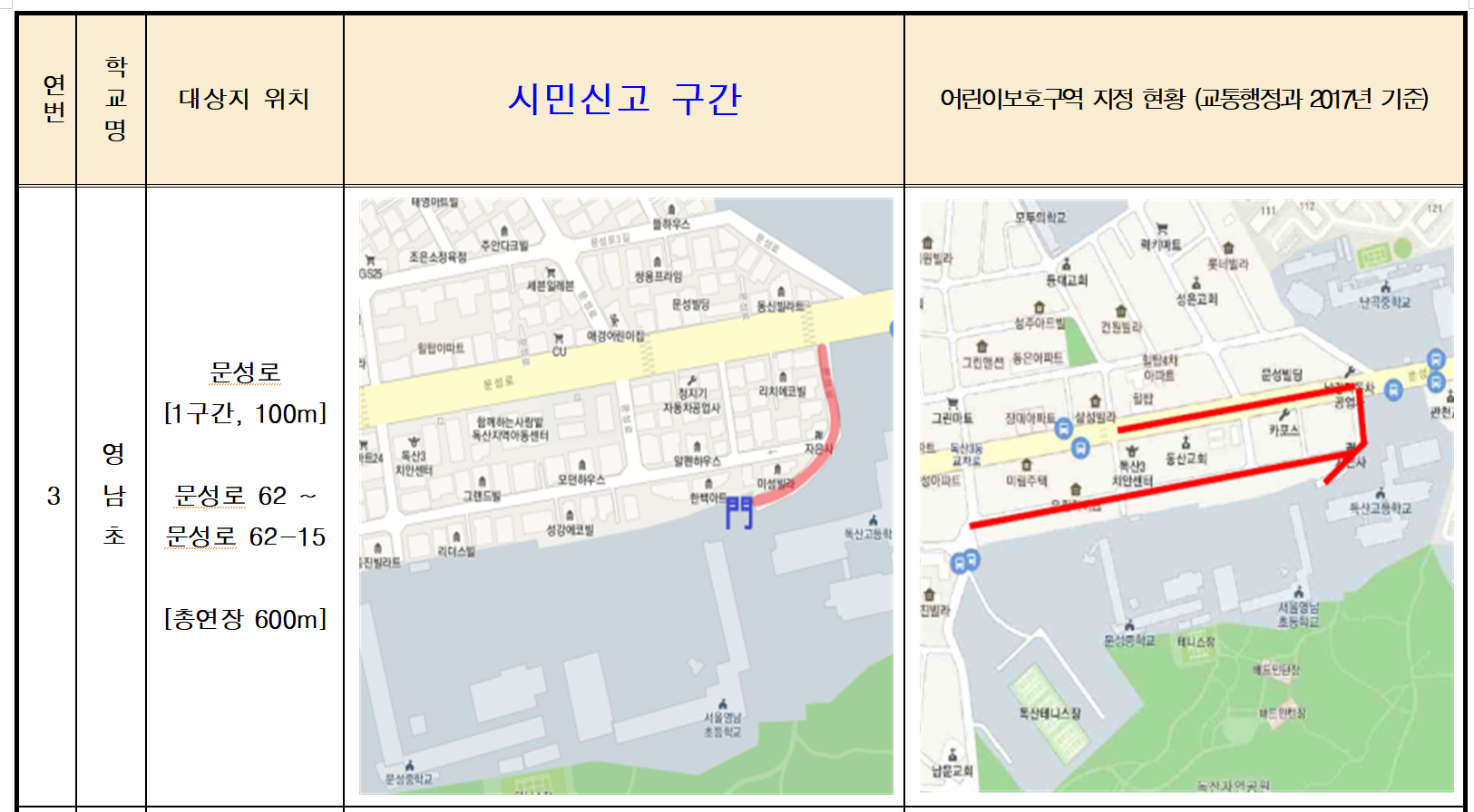 서울 금천구에 있는 영남초등학교는 어린이보호구역이 600미터가 지정되어 있는데, 시민신고가 가능한 구간은 100미터로 일부 구간에 한해 신고를 받고 있습니다.