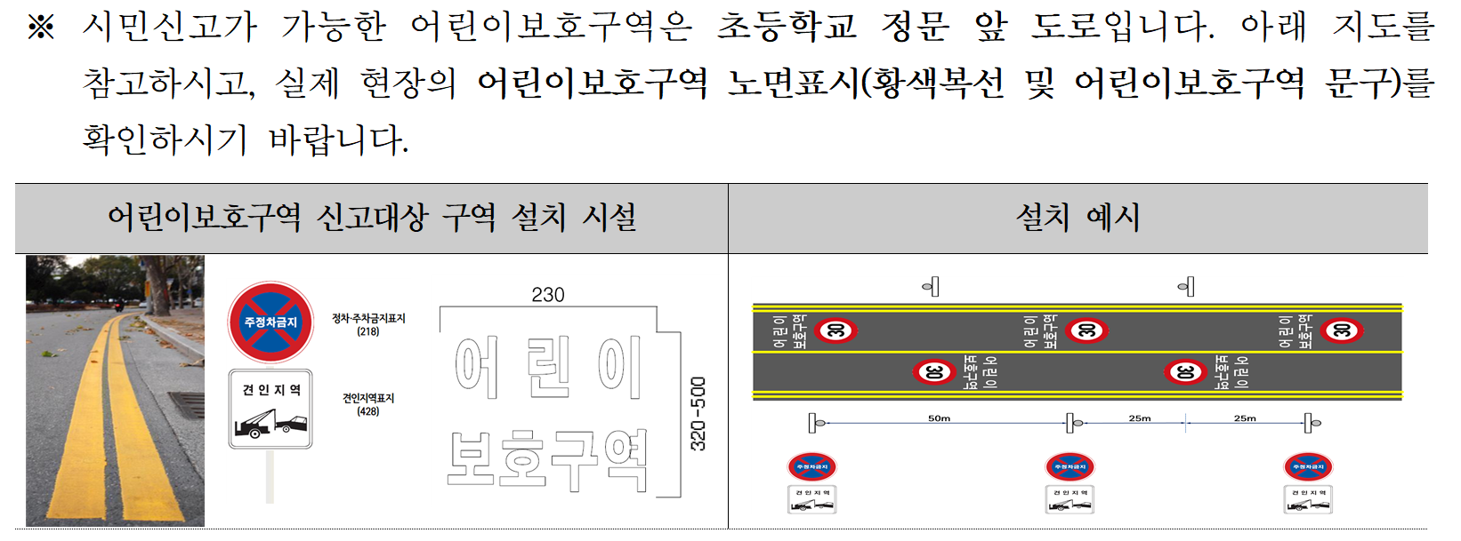 어린이 보호구역의 모든 구간이 신고 대상이 아니라, 그 중에 신고 가능한 구간이 지정되어 있습니다.