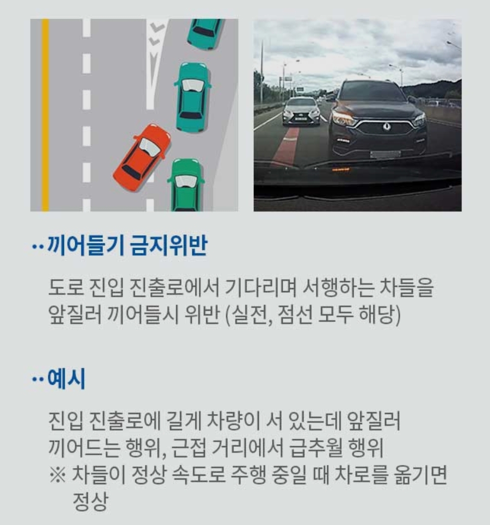 우리가 생각하는 기분 나쁜 끼어들기는 대부분 끼어들기 금지 위반이라고 보면 됩니다.