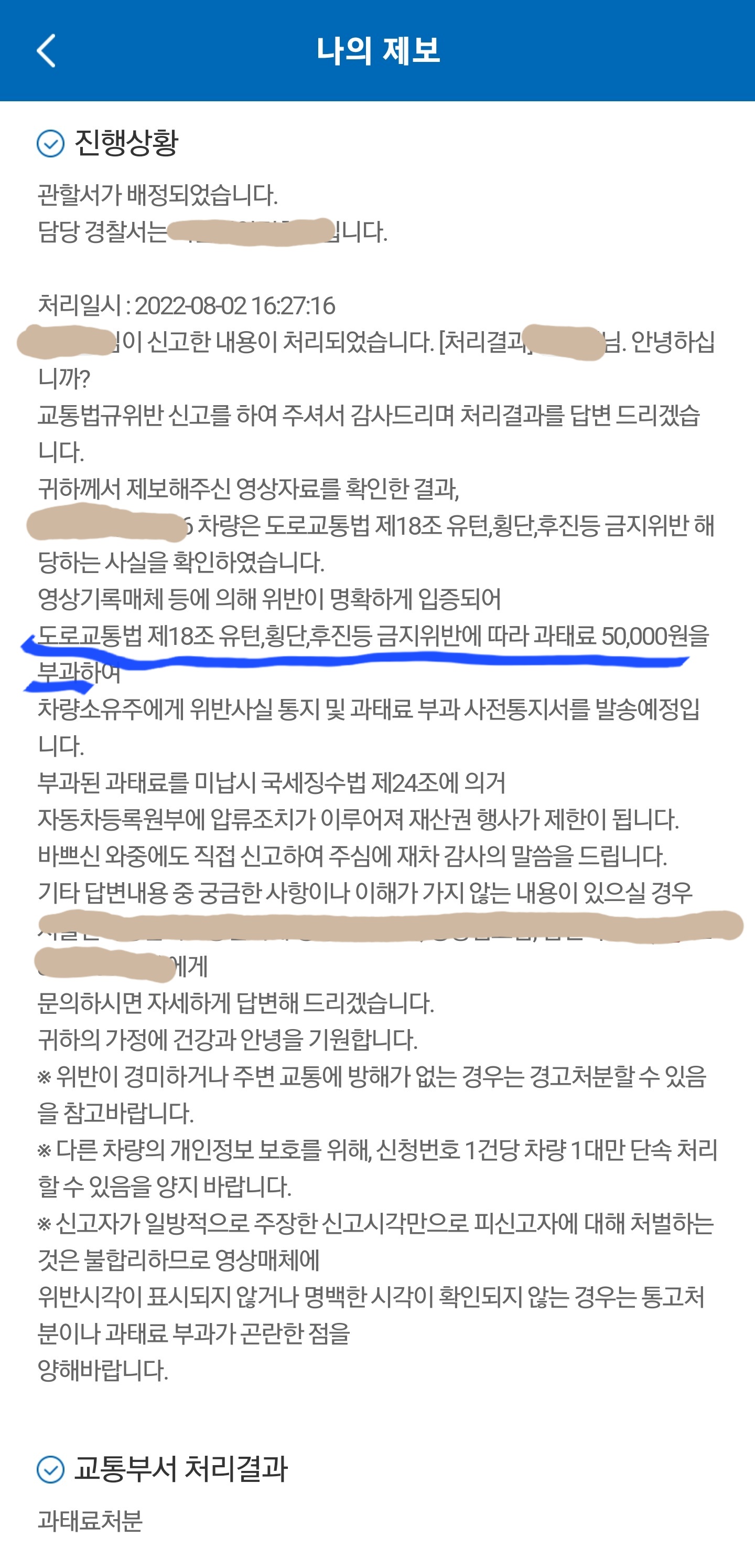 | 자동차 관리법 위반(번호판 오염 및 훼손) | 구청/시청 이관시(1차 : 원상복구명령, 2차 : 과태료 50만원) 경찰 수사배정시(형사고발) |